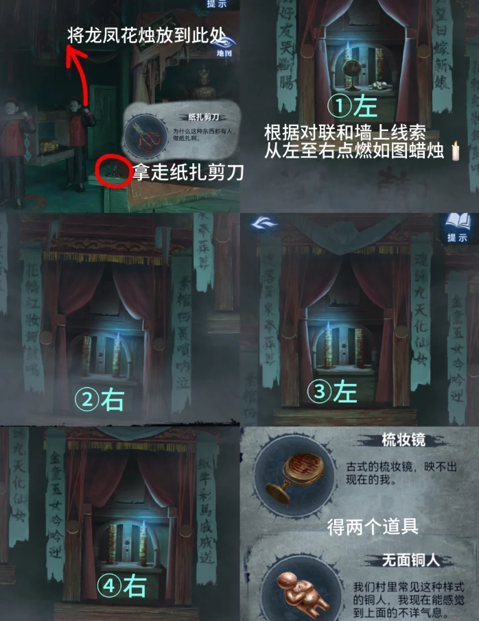 3、地图进六礼轩,拿到【纸扎剪刀】,点左上角悬挂的轿子,将【龙凤花烛】放上去,花到左边得到墙上提示【蜡烛亮为奠,灭为喜】,根据轿子对联提示从左到右依次为【亮灭灭亮亮灭灭亮】得到【梳妆镜】【无面铜人】