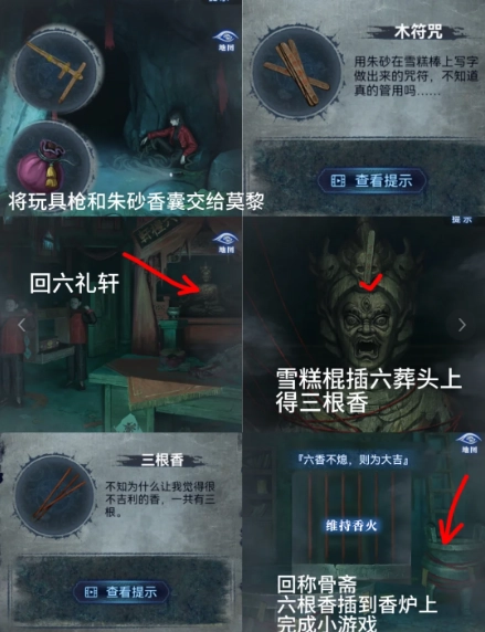 11、地图进称骨斋,将【陶瓷娃娃】放在称骨秤上得到【纸扎剑】【长命锁】,将【纸扎剑】放在右边桌上进入小游戏,根据左侧书架书本提示摆放顺序【天-糕点、鬼-剑、地-糖葫芦、人-陀螺】得到【玩具枪】