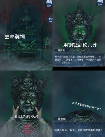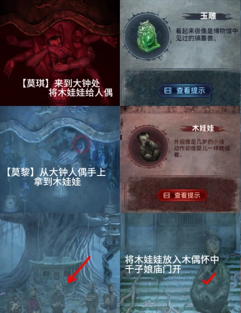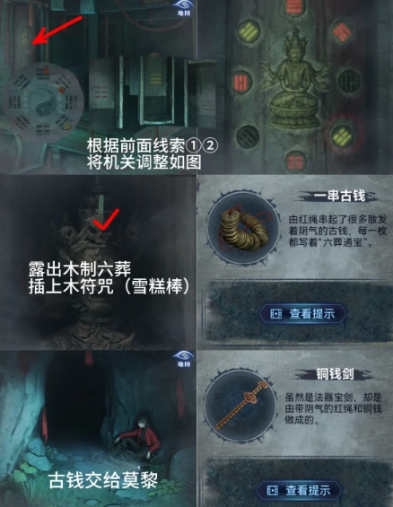 23、点6个神像,将【大铜钱】放在神像上,根据开始的大钟铃铛图案高低依次点击神像【鼓刀钱、官牌木鱼、钱扇】获得【三牲首像】和右侧盘子线索