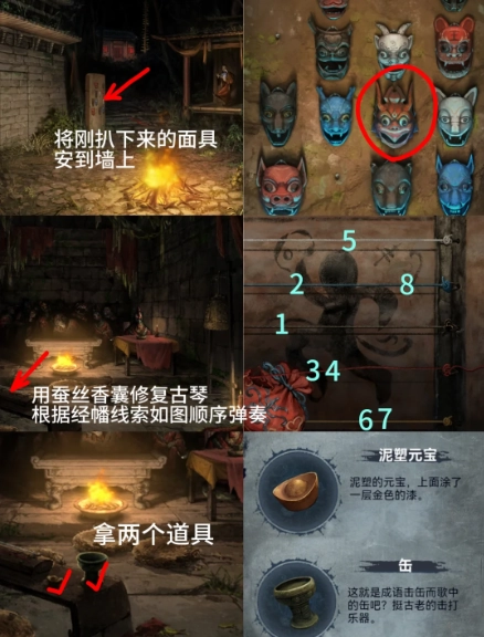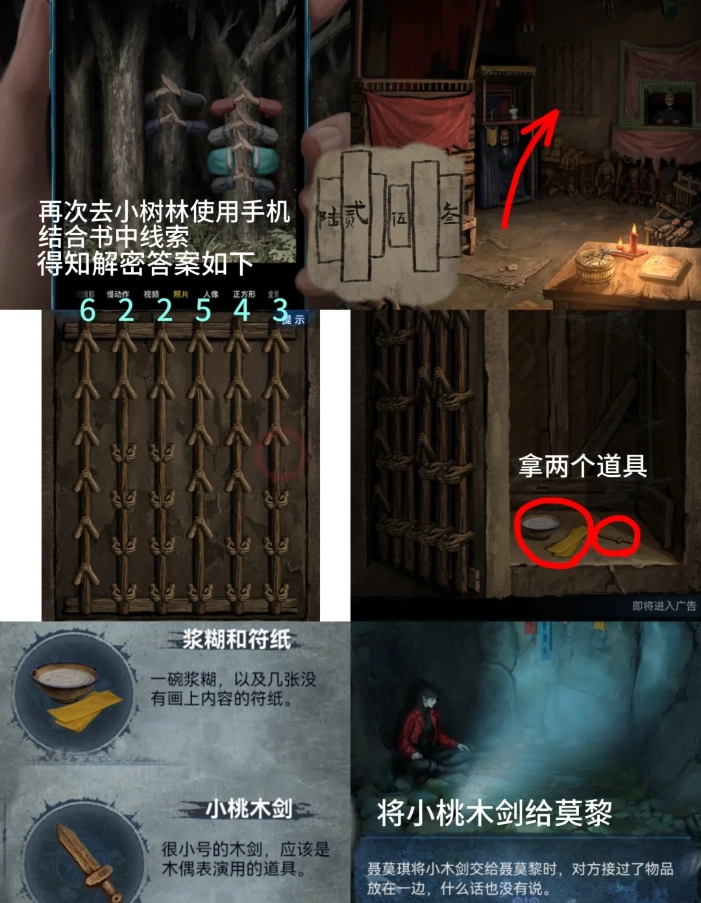 14、回弃煞牢,将【铁枝木偶】放在拿铁棍的木偶师桌上幕布下降将木梳放上去得到牲畜线索【虎4猪6羊7】拖动木屋兽首链条到对应横线获得【阴寒的水】递给宁子服,离开(高能)