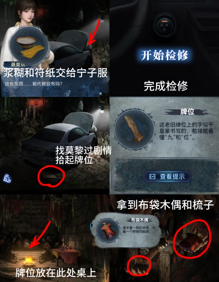 8、车尾地上捡到【排位】,进入石门将【排位】放在供桌上(微恐)得到【布袋木偶】【木梳】