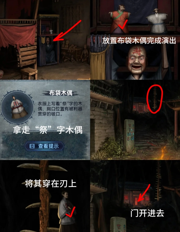 9、进弃煞牢,将【布袋木偶】套在木偶师手上得到新的【布袋木偶】将其插在戏台左侧“刀山”上打开木屋门