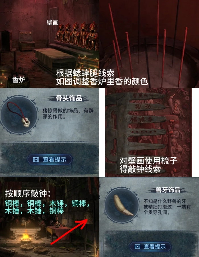 10、进木屋,用【螺丝刀】清理左侧神像手上泥土,将【缶】放上去得到【杖头木偶】,再根据石门内蟋蟀腿线索点亮左下角香炉的香【上排:红黑红黑、下排:红红黑红红】得到【骨头饰品】后递给莫黎