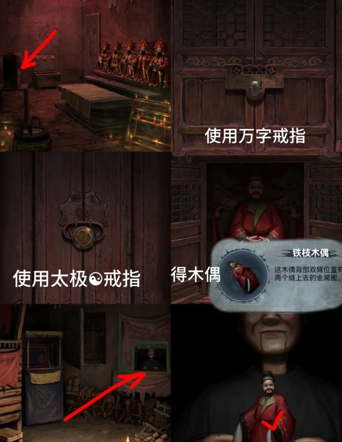 13、回小木屋,用【万字戒指】【太极戒指】打开左侧桌上小房子的两个门得到【铁枝木偶】