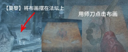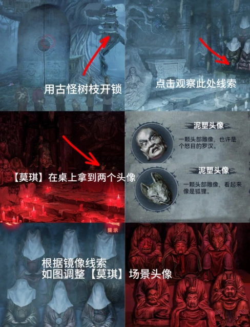 9、进入左侧塔(小高能),点供桌得到【泥塑头像×2】将所有头像放在左边神像上进入小游戏(根据莫黎界面白布形状镜面摆放)