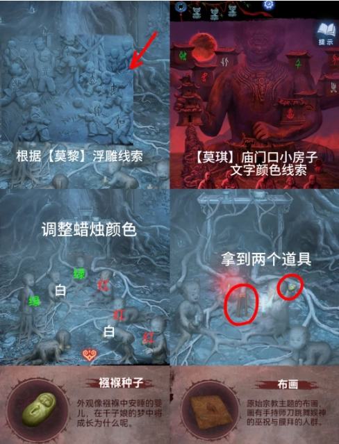 17、根据墙上浮雕结合莫琪界面六藏菩萨手上符号颜色点亮小孩手里的灯,从上到下左到右依次是【绿白红绿红灭白红】得到【画布】【襁褓种子】