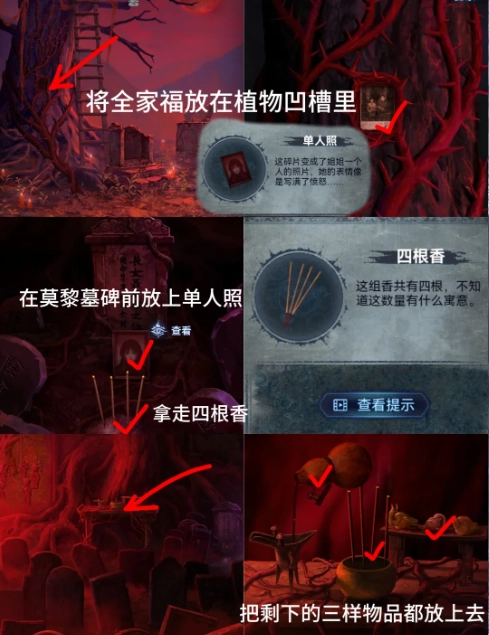 29、将【全家福】放进树上荆棘凹槽内得到莫黎【单人照】,将其摆在庙里莫黎墓碑前得到【四根香】,插进供桌香炉里