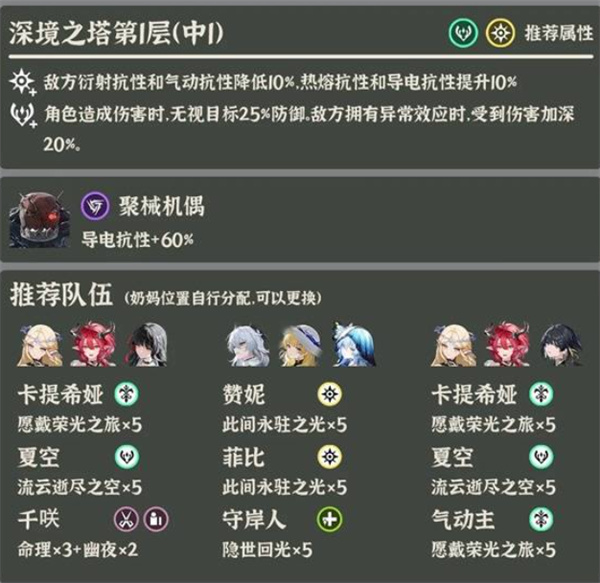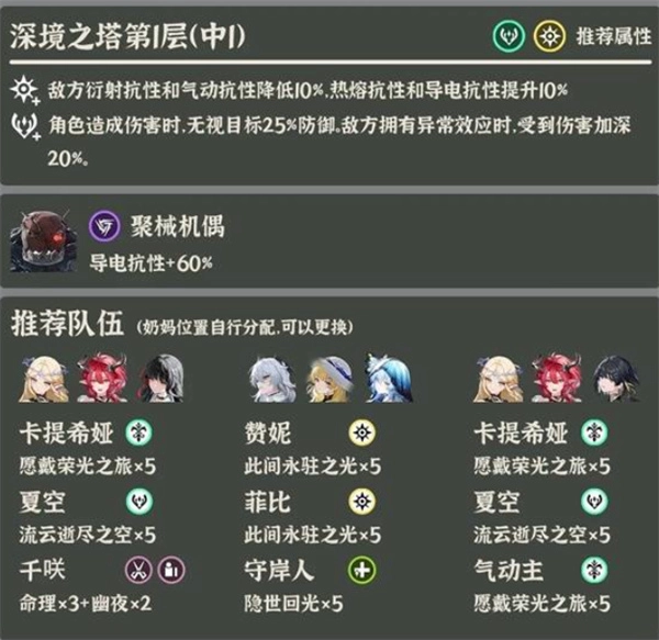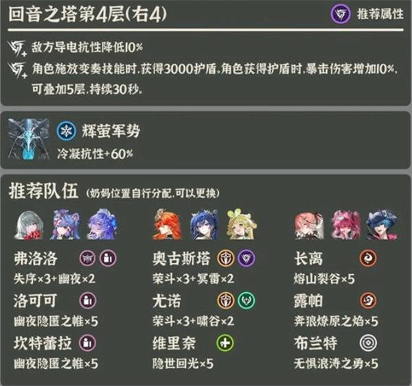 此外,琳奈 + 尤诺 + 守岸人的组合也能使用,但对角色练度和操作要求较高。如果选择琳奈,可以考虑切换为震谐体系来适配该层环境。