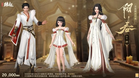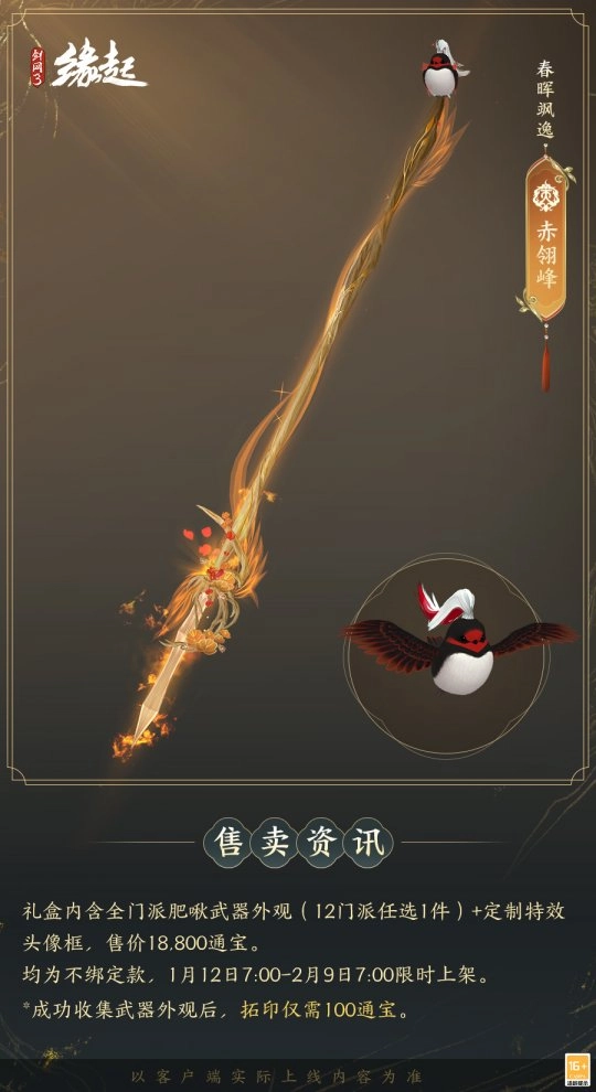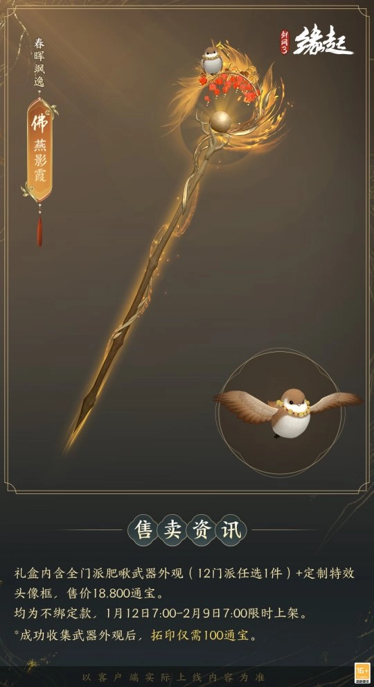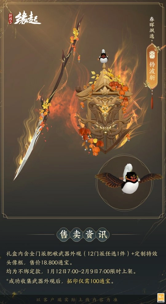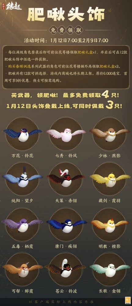 1月12日7:00-2月9日7:00,满级侠士可前往花萼楼领取肥啾任选礼盒x1,购买武器礼盒「群英论武·朝光」的侠士可额外领取肥啾任选礼盒x3!