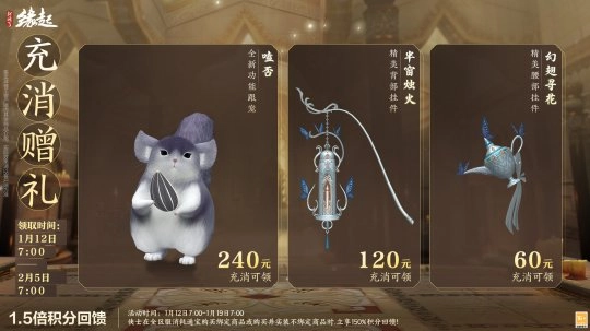 ?1.5倍积分回馈同步开启,1月12日7:00至1月19 日7:00,侠士在全区服消耗通宝购买绑定商品,或购买并实装不绑定商品时,立享150% 积分回馈,积分累积更快,兑换好物更轻松!