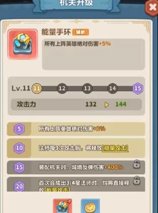 4、能量手环,是一个增伤很强力的机关,绝对伤害的数值非常高。优先5级,之后在所有机关都达到基本等级以后再考虑升10级,虽然机关的增伤都是乘法计算,但是3次攻击后的下一次攻击增加30%伤害,等于4次攻击增伤一次30%,平均下来不如绝对伤害的百分之一,所以10级优先级不高。