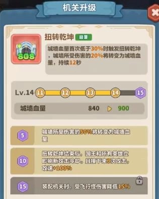 8、金钟罩,一个增加护盾并减伤的机关,数值中规中矩,全部4000的护盾量对于现在高血量的我们有些不够看,新手没有解锁红粉机关时候可以带一带,不推荐优先升级。