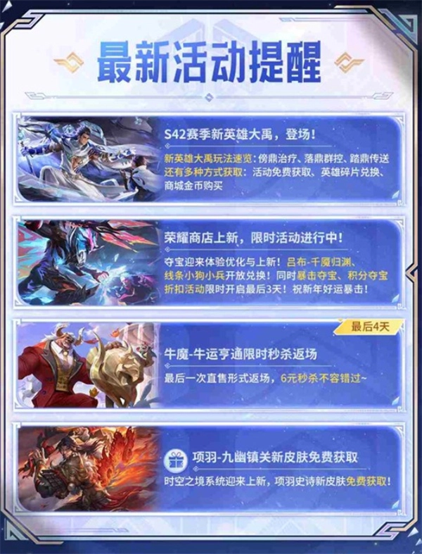 全新英雄大禹(定位:坦克/团控)将在赛季初期通过限时活动开放获取通道。玩家只需参与“治水征程”活动,完成累计登录以及5场对局这两项任务,就能把永久英雄大禹和专属头像框收入囊中。待活动结束后,大禹会正式上架游戏商城,届时玩家可使用13888金币或者58个英雄碎片进行兑换。