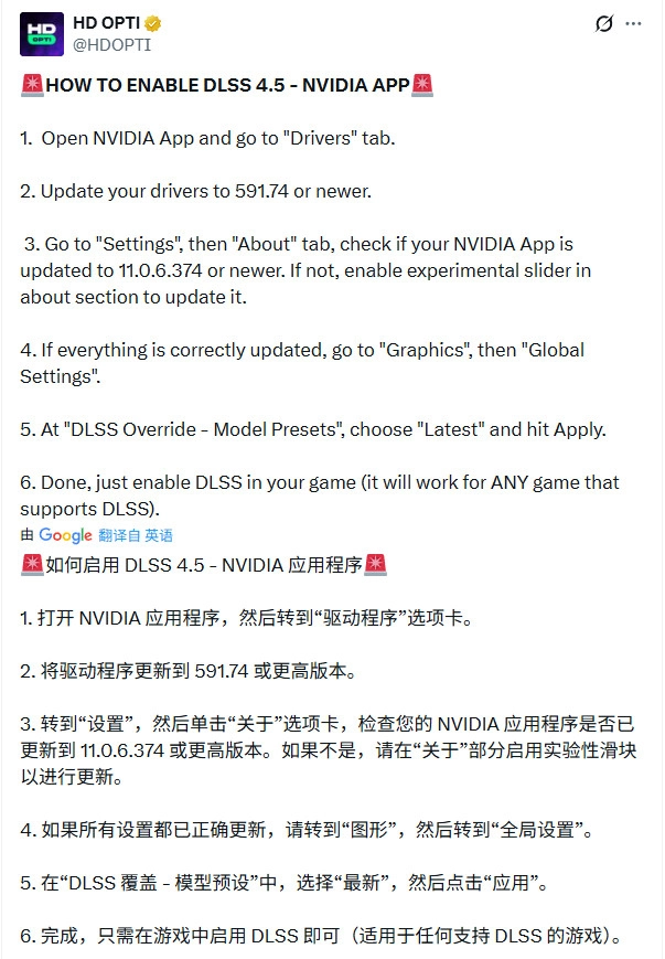 如果玩家当前想要启用DLSS 4.5,方法如下。在英伟达APP中选择加入测试版(BETA),然后安装英伟达在1月5日发布的GeForce Game Ready驱动程序591.74。选择“图形”选项中的"DLSS覆盖:模型预设",将其设置为“最新(latest)”,点击“应用”即可启用DLSS 4.5超分辨率预设。