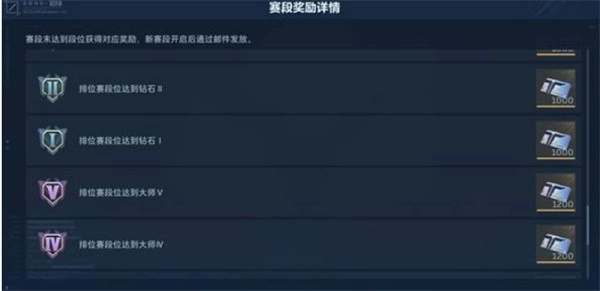段位奖励包括:NZ券、钛金跃迁秘藏、传说钛金跃迁秘藏、头像框、紫色品质武器、巅峰战神名片等