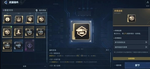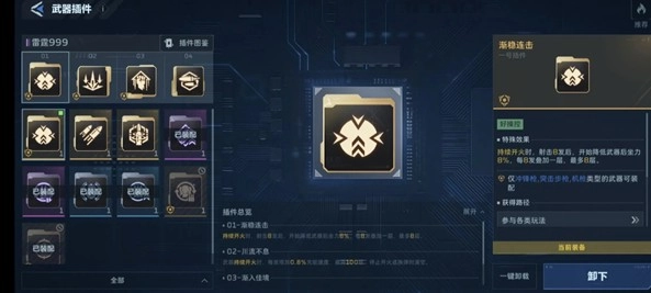 插件1号位建议选择【渐入连击】,它能显著减小999的后坐力,让输出更稳定;官方推荐的大弹夹则没必要选,因为它对子弹数量没有任何提升——这把武器的被动特性是子弹上限为999发,所以无法享受到弹夹加长的效果。