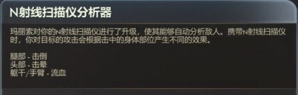 弱点打击:战斗分析仪和N射线扫描分析器(20级)提供了双重保障,确保你总能找到敌人的弱点并施加击倒、眩晕等额外控制,形成控制链。