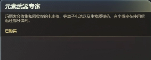 元素武器专家 (15级):有几率在消耗电击棒、等离子电池、生物质弹药时将其回收。这是一个宝贵的资源节约技能,尤其适合频繁使用元素武器或 Gadget 的玩家。