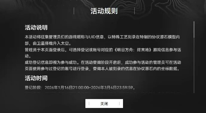 本活动将征集管理员们的游戏昵称与UID信息,以特殊工艺刻录在特制的协议源石模型内部,由卫星搭载升入太空。管理员于本页面登录后,可选择登记该账号对应的《明日方舟:终末地》游戏信息参与活动。成功登记信息即视为参与成功。在活动查询阶段开启后,成功参与活动的管理员可在活动页面使用参与过登记的账号进行登录,查询本人被刻录的信息在协议源石内的坐标数据