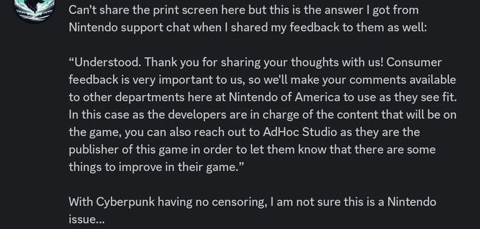 事件在疑似任天堂美国客服的一封回复邮件于网络流传后出现新进展。该邮件截图显示,在回应玩家关于审查的投诉时,任天堂客服代表建议玩家直接联系游戏发行商,因为“开发者负责决定游戏中包含的内容”。邮件中写道:“鉴于开发者负责游戏中的内容,您可以联系《超英派遣中心》的发行商AdHoc Studio,告知他们游戏中有值得改进之处。”