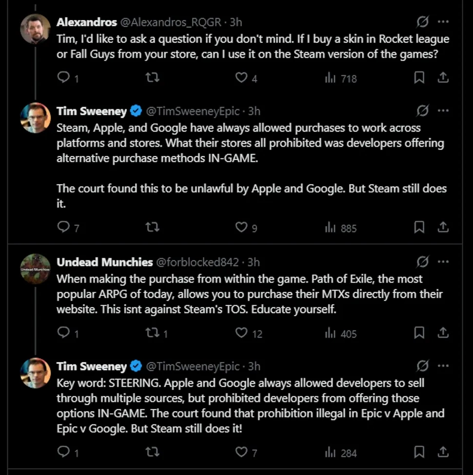 Sweeney在多次回复中承认,Steam激活码和DLC确实可以通过第三方平台购买,但他强调关键问题在于:在遵守Valve规则的前提下,开发商无法在游戏内向玩家提供替代购买方式——这与Epic当年起诉苹果和谷歌的核心逻辑几乎完全一致。