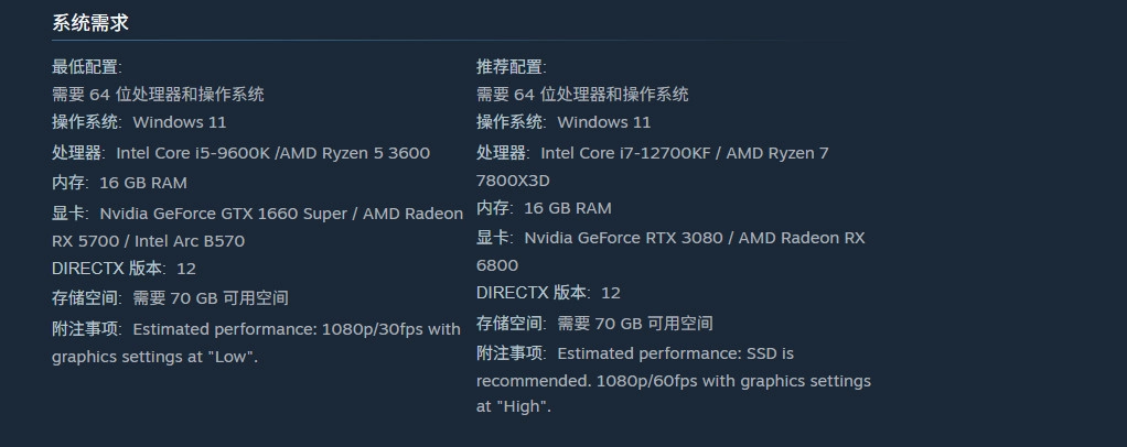 值得一提的是,《噬血代码2》官方给出的PC配置,最低配置需要GTX 1660 Super显卡,但只能玩1080P/低画质/30fps。要想1080P/高画质/60FPS游玩,官方推荐使用RTX 3080显卡。是的,你没有看错,RTX 3080显卡玩这个画质的游戏只配1080P……