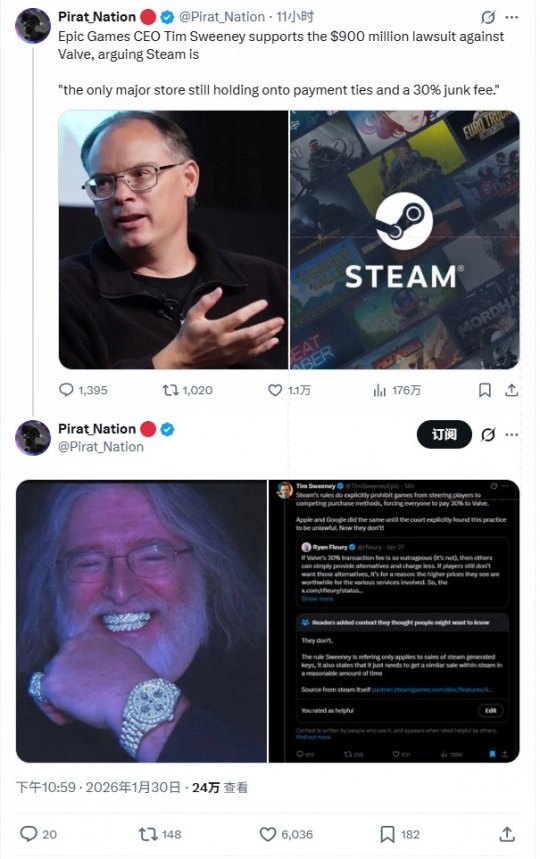 英国针对V社高达9亿美元的诉讼,近日已获竞争上诉法庭批准,将以集体诉讼的形式继续推进。Epic Games的CEO蒂姆·斯威尼(Tim Sweeney)——他同时也是Steam的长期批评者——随即对此发声,支持这起针对V社的诉讼,并认为案件中的指控“站得住脚”。