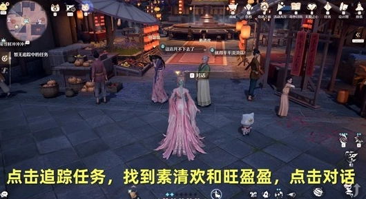 点击追踪任务,找到素清欢和旺盈盈,和她们对话,接取任务;