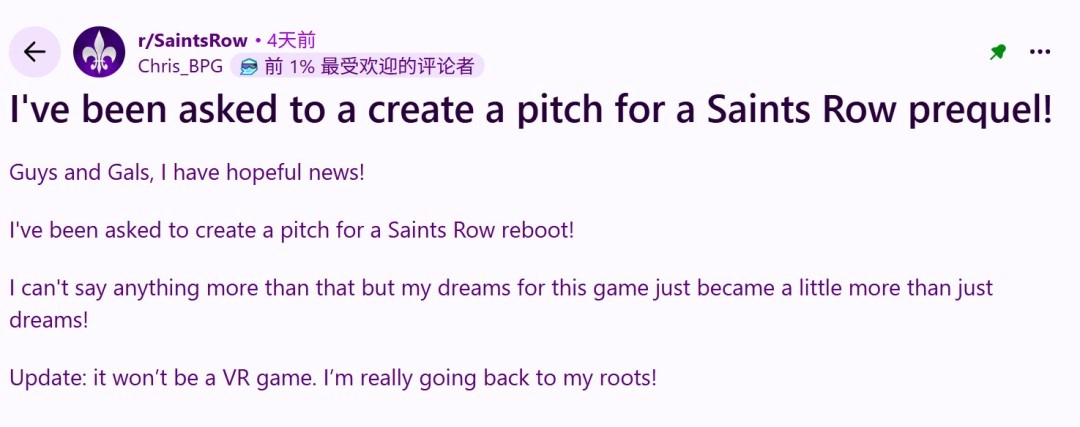 Chris Stockman在《黑道圣徒1》刚发售就离开了开发商Volition,成立了自己的工作室,专注于VR游戏。但Chris Stockman在Reddit上的贴文已经强调,《黑道圣徒》前传非VR游戏,而是一款完整的主机作品。