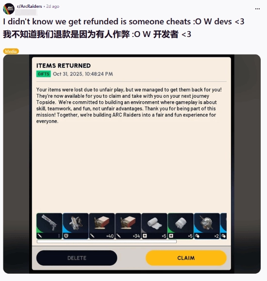 据Gamingbolt消息,《Arc Raiders》开发团队当下正针对遭遇作弊者并丢失物品的玩家进行补偿,就算玩家未主动举报这些作弊者,同样能够获得补偿。