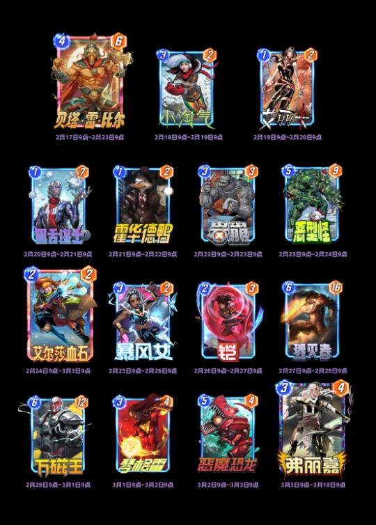 举个例子:小明2月19日 10点登录游戏,那么他只能收到「贝塔·雷·比尔」和「艾丽卡」的变体,因为「小淘气」的变体领取时间已过。