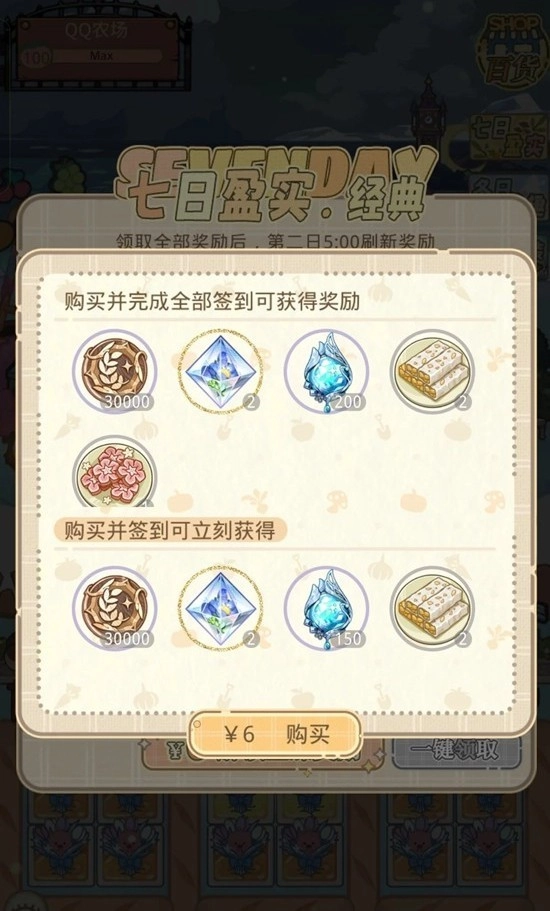在七日盈实处氪6r,签到7天可得200雨露+2北极星+2能量棒+1鲜花饼+3万农场币