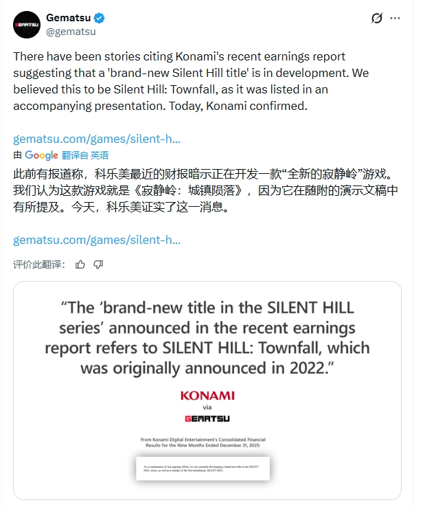 科乐美在最新财务报告中,针对沉寂已久的《寂静岭》系列项目《寂静岭:小镇陨落》给出了官方更新。在这份涵盖截至2025年12月31日九个月业绩的财报里,公司提到目前正推进《寂静岭》系列的一款全新作品以及初代重制版的开发工作。
