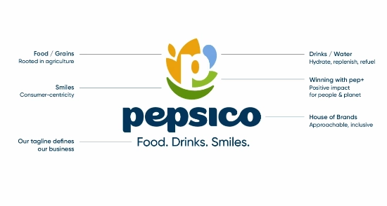 金黄色的麦穗形状象征着品牌旗下的乐事薯片零食及谷物;蓝色水滴寓意着旗下的百事可乐饮料与水源;浅绿色部分意味着“致力于对人们和地球产生积极影响”;深绿色则代表“微笑” 。