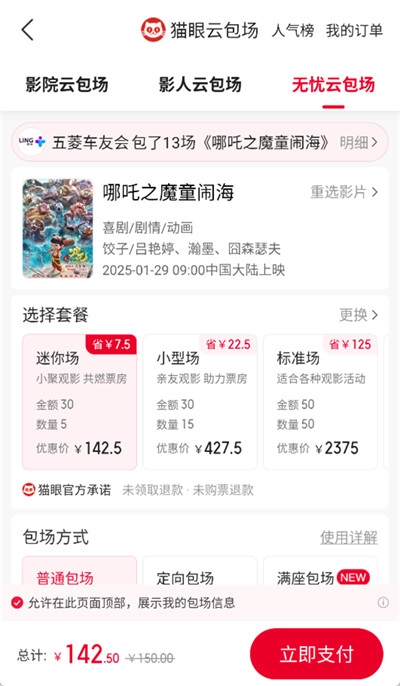 3、点击后进入包场支付界面,在此界面中可选择多种包场方式,涵盖迷你场、小型场和标准场等不同包场规模。