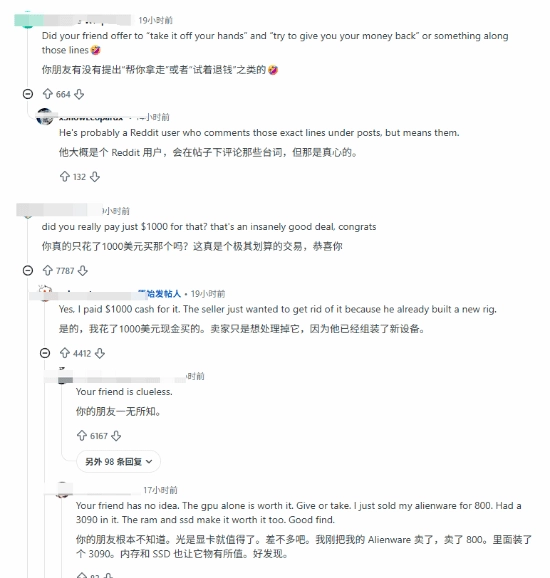 不过好在了解硬件的网友数量很多,都告诉他这套硬件的价值,并且猜测是否是这名“朋友”想低价捡漏或者以为3090这张卡已经过于久远的缘故。毕竟如果是一部五年前发售的手机现在已经进入淘汰边缘了。