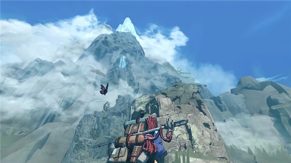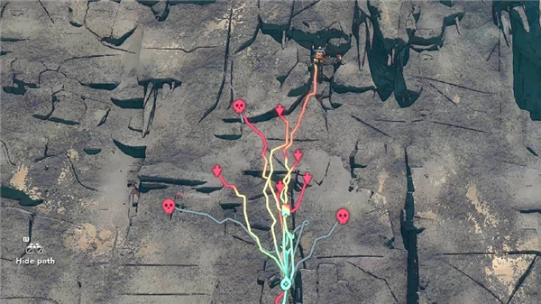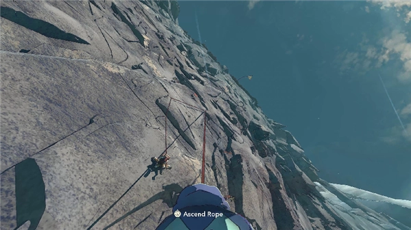 更具挑战性的是,游戏没有预设任何固定路线,所有的岩壁都向玩家开放探索。玩家可以通过专门的“勘探”功能,从上下左右、近远不同角度观察山体,寻找可行的攀爬路线:有的路线距离较短,但岩壁光滑、抓握点稀少,难度极高;有的路线虽然漫长,却布满了稳固的突起与裂缝,相对安全。但这种自由性的设定,也让每一次攀登都有着各种不确定因素,例如在攀爬中途,玩家可能发现原定路线被一片光滑的岩壁阻断,从而不得不重新规划方向;也可能在偶然间,找到前人留下的路线地图,借助这份线索少走弯路。