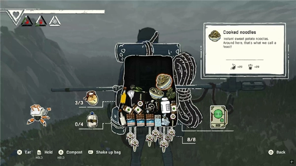 不仅如此,艾瓦的身体也有着严格的生存指标:饱食度、口渴值、体温值以及心脉,都会随着时间的推移和攀爬的消耗不断下降。玩家需要在攀爬过程中,不断收集资源:在瀑布、溪流处补充水资源;在地面拾取草药、在防熊箱、冷却罐中寻找食物;以及在前人丢弃的背包里,或许还能找到珍贵的药品、工具甚至食谱。最重要的是烹饪系统的存在:玩家可以将一种液体与一种固体食材任意组合烹饪,得到不同食物,比如清水加草药能熬制出恢复药水,牛奶加鲫鱼能煮出鲜美的鱼汤。这些烹饪而成的食物,不仅能恢复艾瓦的饱食度、口渴值,还能提供各种BUFF增益,如专注力提升、抓握力增强、体温维持更久等。