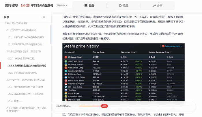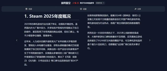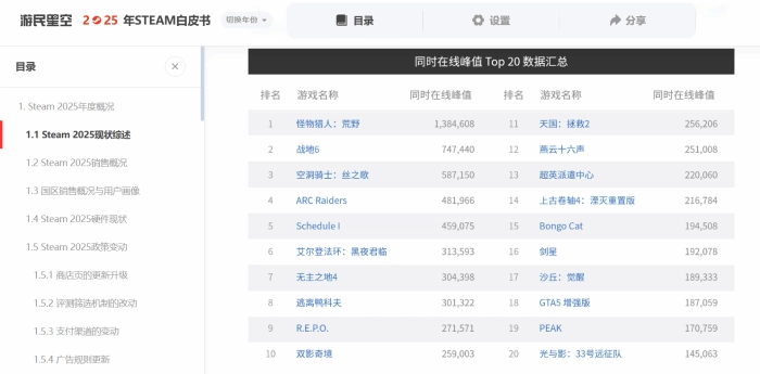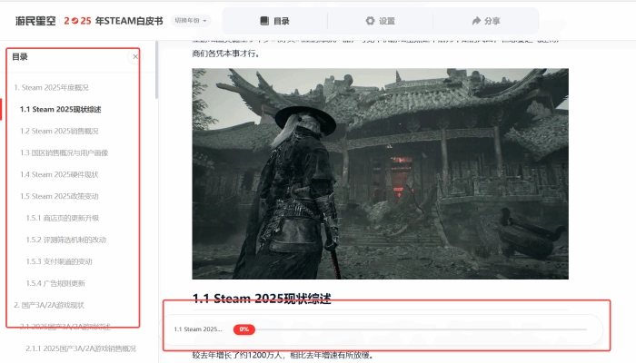 所以,这里能看到些什么? 在这里,您可以看到2025年Steam平台各项数据的详细统计、有关商店页、愿望单等最新的平台政策与机制变动,并深入了解各类游戏的销售趋势与国区用户的整体偏好;对于国内年度热门游戏与行业最新动向,我们也将通过专题分析,力求以宏观趋势与微观案例相结合的方式,帮助您更好了解国产游戏背后的故事,并为独立游戏开发者提供一定的经验与参考;近年来AI、游戏优化、主机硬件等更多游戏圈相关的热点话题,也都将在2025年的白皮书中为您一一呈现......