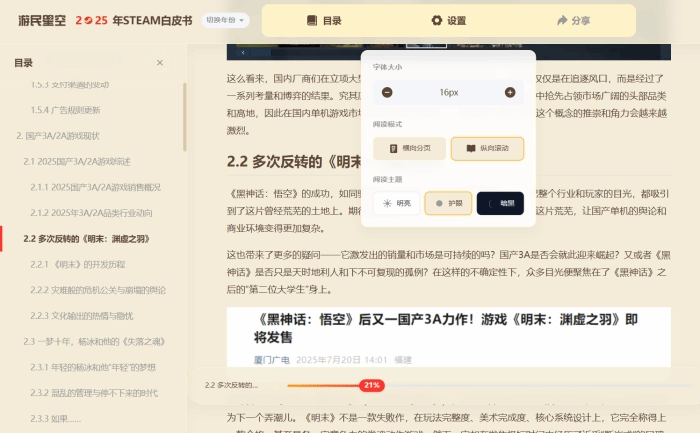 今年的白皮书将支持各种阅读器功能,您现在可以自由调整字体大小、横纵分页等不同的阅读模式,同时也可以选择不同的阅读主题,以此在不同时间段获得更加舒适的阅读体验: