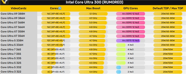 酷睿Ultra 300系列一共六款,7 365/355、5 335/325四款都是4P+4LP 8核心,4个Xe3核心,睿频4.5-4.8GHz。