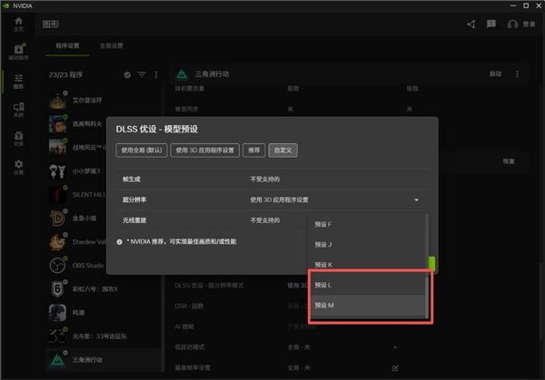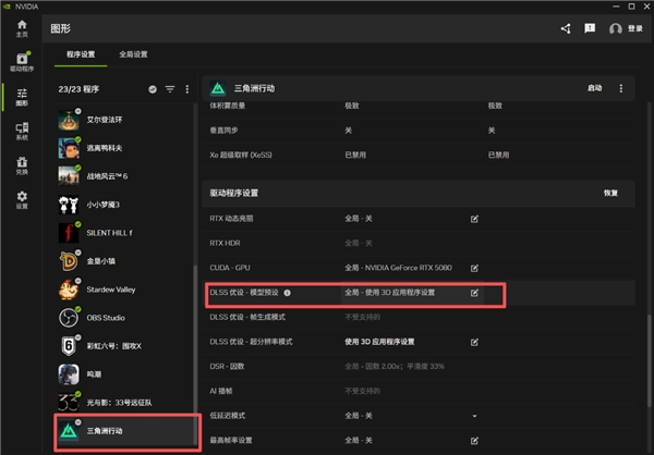 在图形设置界面,点击游戏顶部的【程序设置】选项卡,找到《三角洲行动》在驱动程序设置中,向下滚动找到【DLSS优设-模型预设】选项,并点击进入