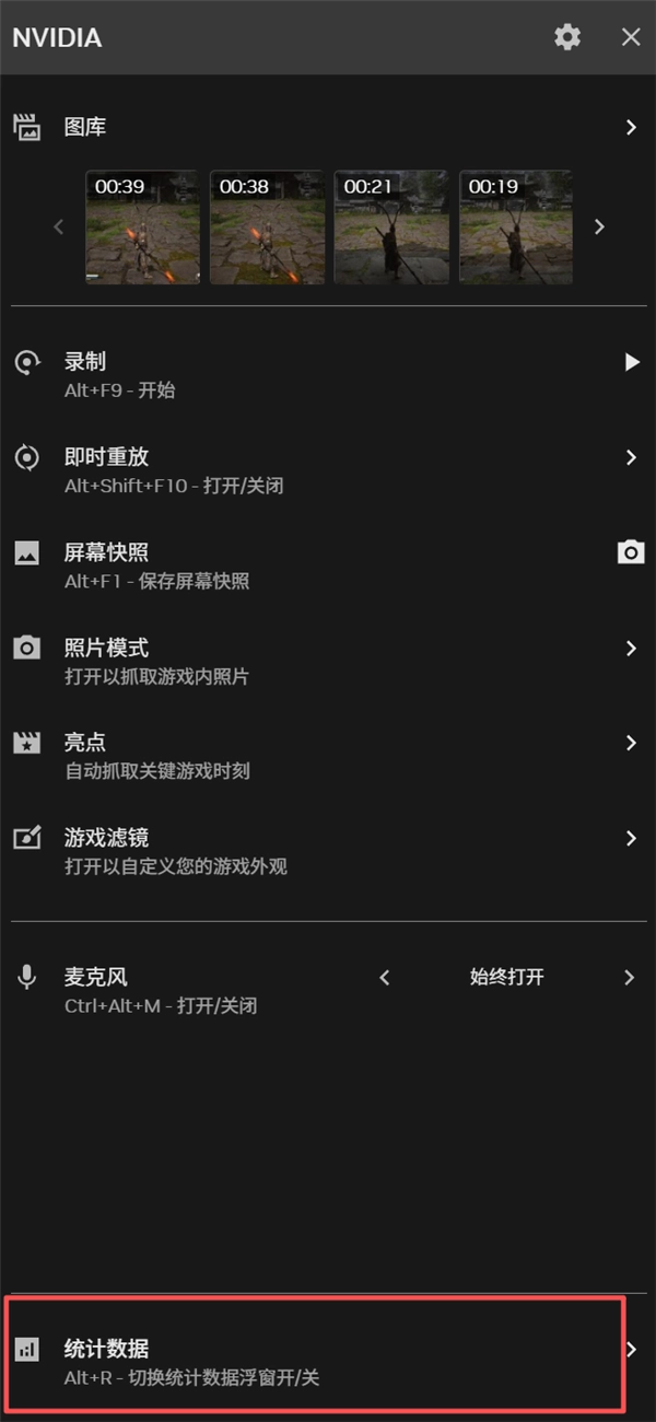 按住键盘上的Alt+Z键,打开NVIDIA浮窗,点击最下方的统计数据
