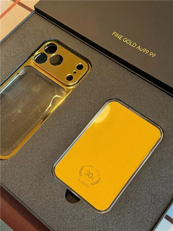 根据晒图显示,京东京造黄金手机壳采用礼盒包装,其中内涵一款金色手机壳+投资金片(金条)。