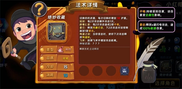 2、核心玩法就是掉盾就用加盾的法术触发神速一边走位一边输出,能扛能打,机动性也不赖,很有意思的角色。运气好拿到电手套就只用电刀,拿到毒相关宝物就毒匕。