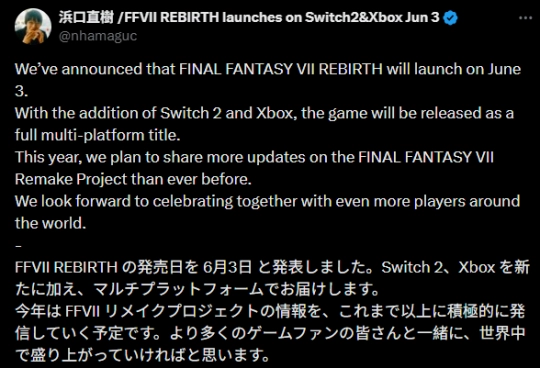官方于今日上午宣布,《最终幻想7》重制版将登陆Nintendo Switch 2与Xbox Series X|S平台。此前该系列独占索尼平台的壁垒已出现松动,预计最终的第三部作品仍有极大可能实现全平台首发。