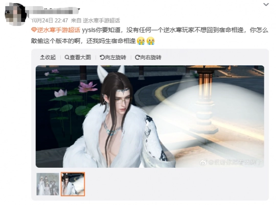 “所有江湖偶遇,都是宿命相逢。”这句话不仅仅是《逆水寒》手游的Slogan,还包含了玩家们太多的感情回忆。以至某游戏在近日公然使用擦边关键词后,遭到无数逆水寒玩家的自发声讨。他们有的张贴证据,有的予以声援,只为守护好那份宿命相逢的最初信仰。由此不难看出,宿命相逢其实是大家心目中的白月光,是不容亵渎的信仰。