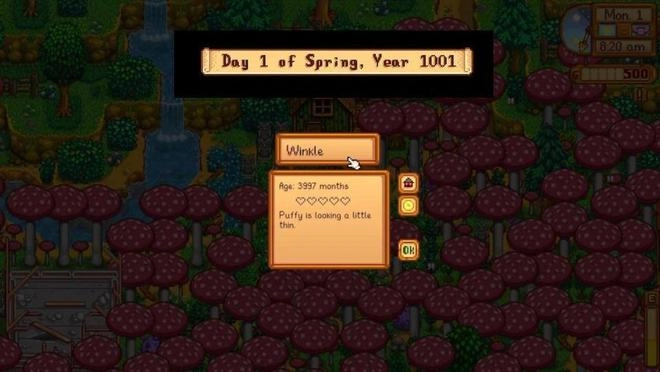 当游戏时间到1000年,Holozard操控角色走出房屋,农场被随机物件填满,树木杂草肆意生长,巨型蘑菇随处可见,还出现大量陨石和猫头鹰石像。网友统计有64颗陨石、258座猫头鹰石像。他花三个季节砍树清理视野。