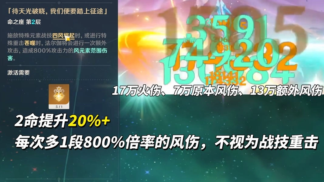 2命20%+,每次施放特殊战技或特殊重击时,追加一段800%倍率的范围风伤。注意,此段伤害不会触发天赋中战技重击提升220%的效果;