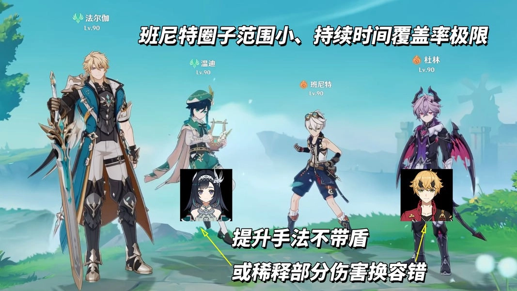 班尼特,对大多数玩家来说覆盖率不够,且法尔伽普攻会前进容易走出圈子。可通过缩轴打出关键爆发以及调整施放位置改善体验,不过仍然期待有更契合的辅助角色。